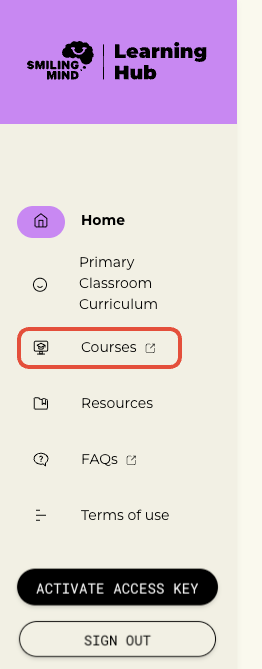 - Click on the menu item titled 'Courses' in the main menu on the left hand side in Learning Hub