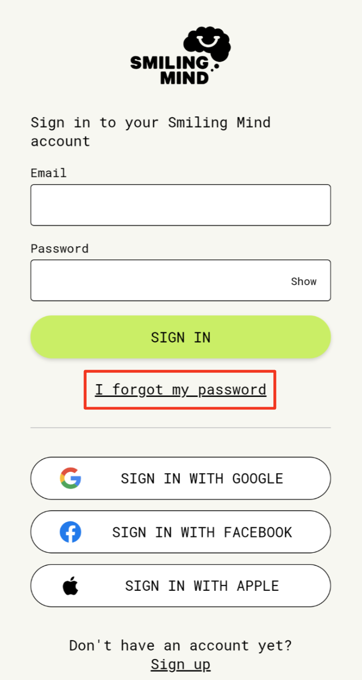 - Either open the app or go to app.smilingmind.com.au and click “Sign In”