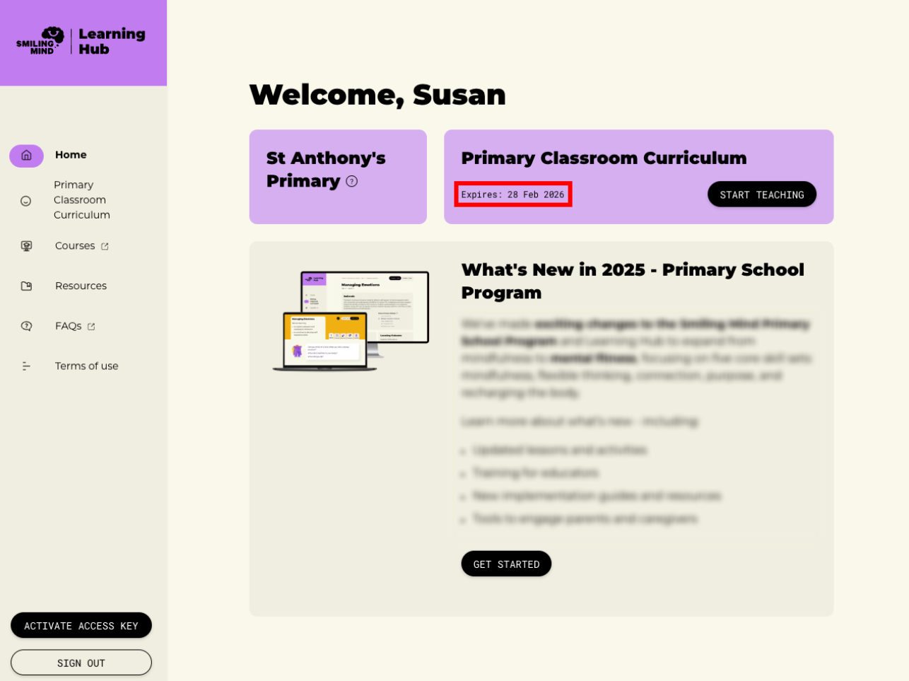 Primary Classroom Curriculum access can be purchased for a 12 month period. Your expiry date is 12 months after your purchase date, and is displayed in Learning Hub here (in red):